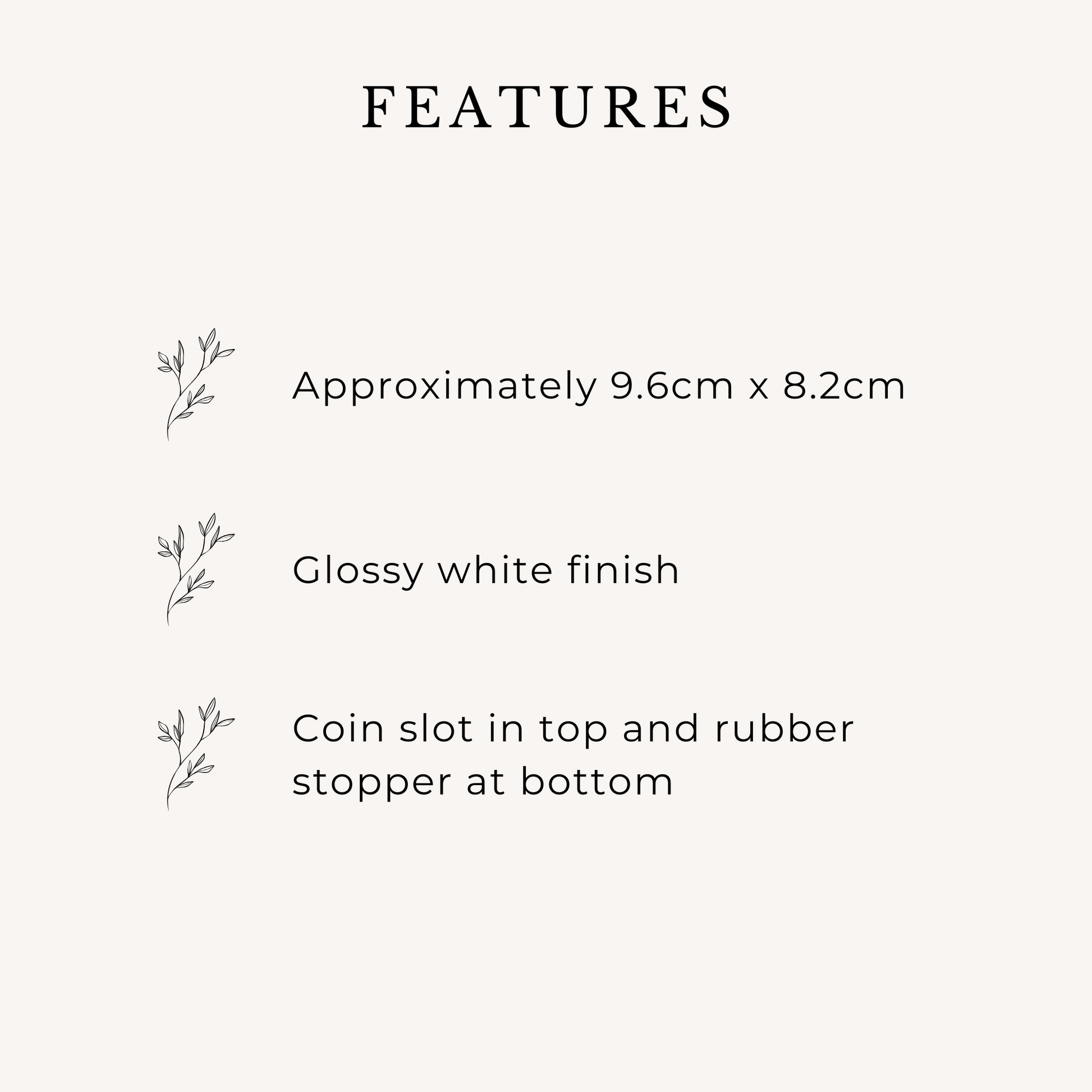 The money box has a glossy white finish and has a rubber stopper at the bottom.